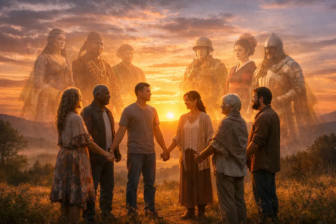 Создайте реалистичное кинематографичное изображение разношёрстной группы людей, стоящих кругом на закате, с мягким золотым светом вокруг них, с едва заметными прозрачными силуэтами их исторических версий из прошлого за каждой фигурой, как знак множества жизней, высокая детализация, духовная атмосфера, природный пейзаж на фоне.