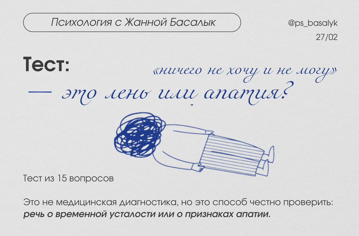 «Я ничего не хочу». «Даже отдых не радует». «Раньше переживал — теперь как будто выключился». Это не медицинская диагностика, но это способ честно проверить: речь о временной усталости или о признаках апатии. Отвечайте «да» или «нет». Стали ли вы меньше интересоваться тем, что раньше вызывало эмоции? Трудно ли вам начать даже простые дела, хотя вы понимаете их важность? Бывает ли ощущение «я ничего не чувствую»? Замечаете ли вы, что даже приятные новости не вызывают радости? Сложно ли вам ждать чего-то с интересом? Чувствуете ли вы вялость даже после отдыха? Перестали ли вы предлагать идеи, начинать разговоры, проявлять активность? Ловите ли вы себя на частой мысли «без разницы»? Было ли у вас раньше много напряжения и переживаний, а теперь стало «тихо»? Стали ли чувства менее яркими — и негативные, и позитивные? Трудно ли вам заставить себя делать даже то, что объективно несложно? Сложно ли вам строить планы, потому что «не чувствуется смысла»? Замечаете ли вы замедление мыслей или де