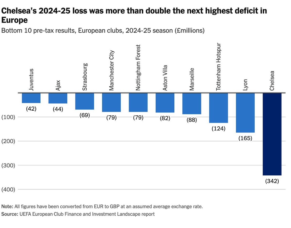 По итогам сезона 2024/25 "Челси" отразил рекордный в Европе убыток — 342 миллиона фунтов, до налогов 💰