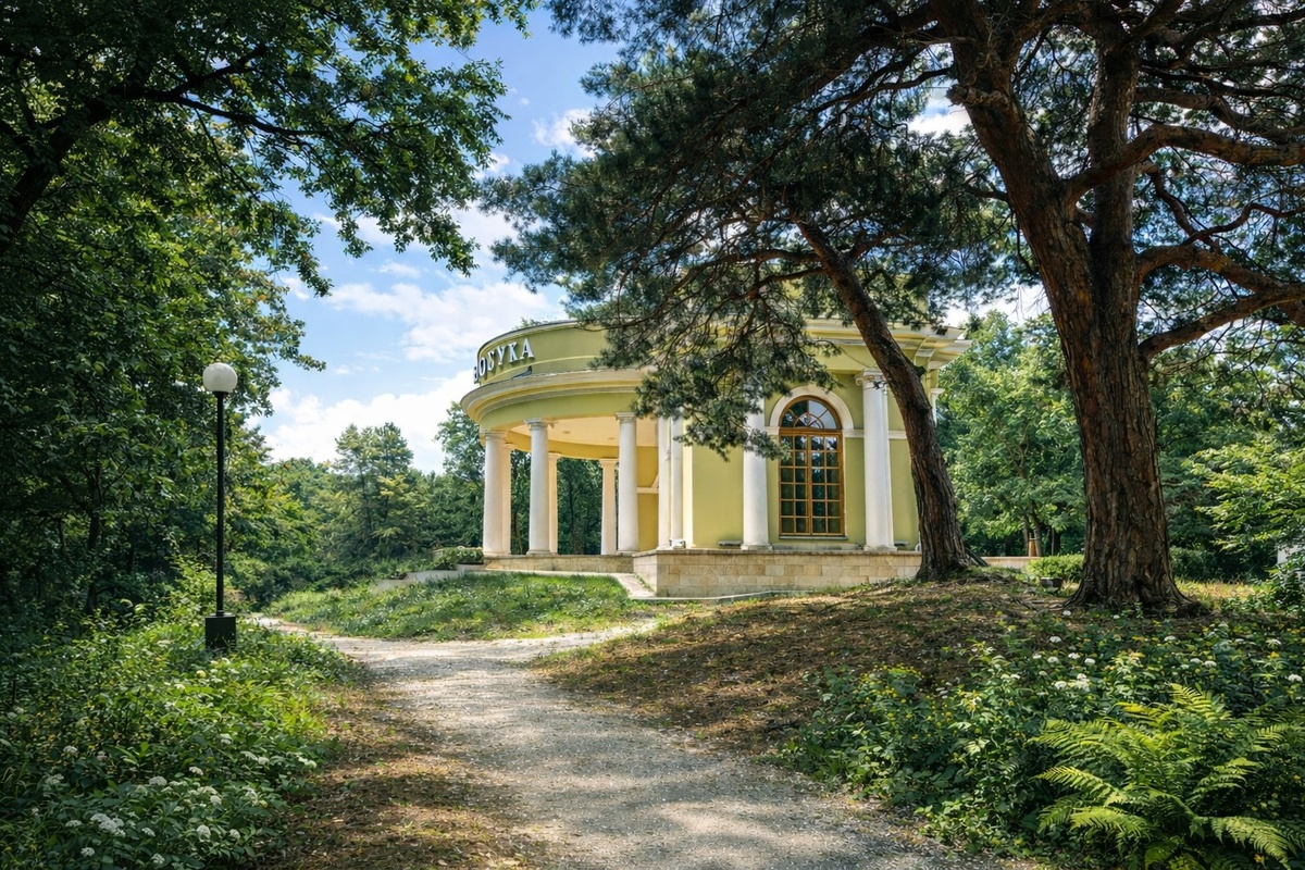 В каждом курортном городе есть точка, куда приходят не просто ради галочки "я тут был", а за ощущением. В Кисловодске таким местом давно стал "Храм воздуха". И нет, это не религиозное сооружение. Это павильон, посвящённый… воздуху. Да-да, тому самому, которым мы обычно пользуемся не задумываясь и без благодарности. Павильон построили на высокой точке Среднего парка не случайно. Отсюда открывается роскошная панорама на Эльбрус и окружающие его горы. В ясную погоду снежная вершина буквально парит над горизонтом. Фото получаются такие, что друзья начинают подозревать фотошоп. А вы просто стоите, щуритесь от солнца и понимаете, что ради этой панорамы всё было не зря. "Храм воздуха" — это классическая полуротонда с шестью колоннами, широкая лестница, плоская крыша и симметричные помещения по бокам. Построили его летом 1914 года по проекту архитектора Н. Н. Семёнова. Свет заливает павильон мягко и щедро, а пространство словно создано для неспешных прогулок. Здесь приятно просто присесть на с