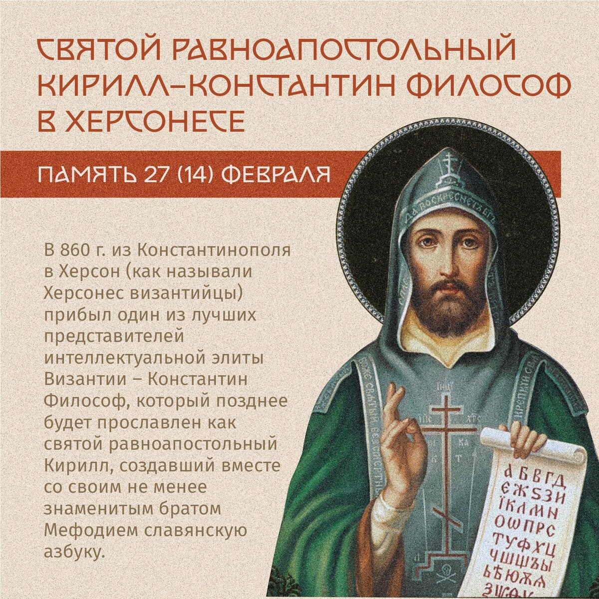 27 (14) февраля – день памяти святого равноапостольного Кирилла