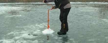 - Следует осторожно оканчивать бурение лунки, если вы будете рыбачить в мелких местах. Есть вероятность того, что лёд будет лежать на дне водоёма, и если сходу вогнать ножи в песок, то нам придётся либо их точить, либо производить замену. Пару оборотов ножей по песку, приведёт к их утрате. Именно поэтому лучшим вариантом будет, пару раз подряд вытряхнуть ледяную крошку из углублённой лунки, это даст нам возможность, оборот за оборотом приблизиться к опасной зоне. Если, подо льдом будет находиться вода, то нижний край лунки будет влажным . А если, покажется песок, его также будет видно, следует немедленно прекратить вращение ледоруба.