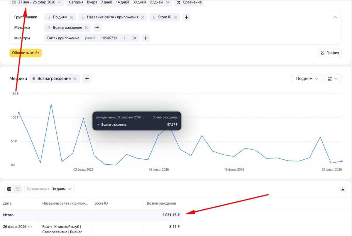 Я и сам в прошлом году проводил эксперименты на в инвестициях на бирже – облигации, акции, дюрации вот эти вот все… На мой взгляд биржа – это отличный способ беднеть медленнее остальных, не более. Я уже более 10 лет занимаюсь сайтами и заработком в интернете. Так в прошлом году я начал пробовать зарабатывать в Telegram (пока не признана экстремисткой организацией). Вот вам свежий кейс с цифрами без воды. Последовательность действий: 1.) Купил (26.01.2026) с рук телеграм канал про книги - 📚Fearn | Книжный клуб | Саморазвитие 2.) Добавил в РСЯ и Telega.in 3.) С помощью клонера (писал о нём тут) подвязался к трём рандомным каналам про книги – т.е. наполнение и ведение ведётся автоматически. 4.) Всё. Сделал срез за один месяц (вы находитесь тут – 26.02.26). Что по цифрам? РСЯ – 1031 Telega.in – 1837 Итого: 2862 рубля или за 1 месяц 19% или 228% годовых Конечно, можно сказать, что это, по сути, мышиная возьня – но в защиту могу сказать: 1.) Доход полностью пассивный и не требует в