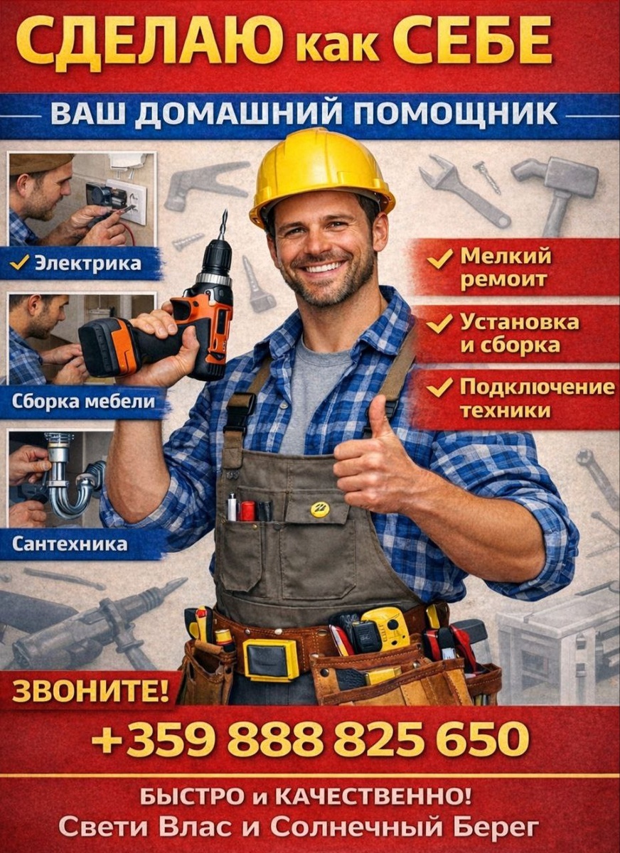 👨🔧ДОМАШНЕГО ПОМОЩНИКА Оперативная помощь: 🔧 Мелкий бытовой ремонт (двери, замки, ручки, мебель, покраска) 💡 Электрика: замена/перенос ламп, розеток/выключателей, светильников, подключение бытовой техники. 🚿 Сантехника: краны, сифоны, протечки, душевые, стиралки 🪛 Сборка и установка мебели, карнизов, полок, врезка плиты мойки 🧼 Подготовка апартаментов к заезду гостей 🛏 Мелкие работы после выезда (подкрутить, починить, заменить) 📦 Приём доставок, контроль мастеров на объекте 🌿 Балконы и террасы: мелкий уход и приведение в порядок Разовые заявки и постоянное обслуживание. Свети-Влас, Солнечный берег ☎️ Тел/WhatsApp/Telegram: +359888825650 ☎️Telegram: +37360845785