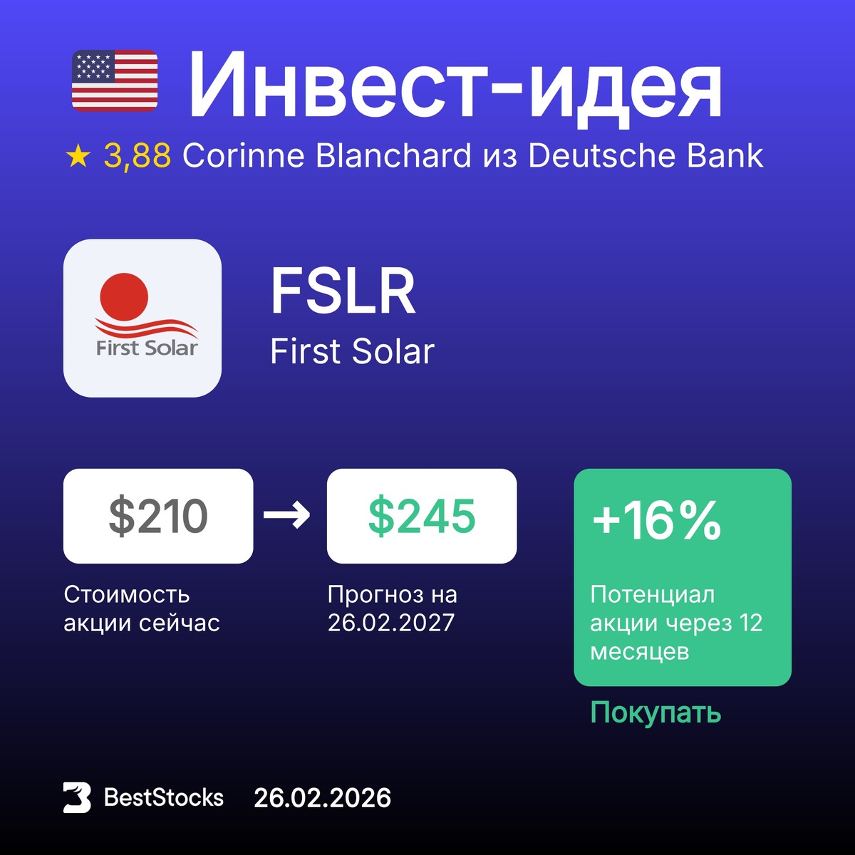 Π’ΠΈΠΊΠ΅Ρ: FSLR ΠΡΠΎΠ³Π½ΠΎΠ·Π½Π°Ρ ΡΠ΅Π½Π°: $245 (+16%) Π Π΅ΠΊΠΎΠΌΠ΅Π½Π΄Π°ΡΠΈΡ: ΠΠΎΠΊΡΠΏΠ°ΡΡ InvestRank Π°ΠΊΡΠΈΠΈ: 6 ΠΈΠ· 10 ΠΡΠΎΠ³Π½ΠΎΠ· ΡΠ΄Π΅Π»Π°Π½: 26.02.2026 ΠΡΠΎΠ³Π½ΠΎΠ· Π΄ΠΎ: 26.02.2027 ΠΠ½Π²Π΅ΡΡ-ΠΊΠΎΠΌΠΏΠ°Π½ΠΈΡ: Deutsche Bank ΠΠ½Π°Π»ΠΈΡΠΈΠΊ: Corinne Blanchard ΠΡΡ ΡΠ΅ΠΊΠΎΠΌΠ΅Π½Π΄Π°ΡΠΈΠΈ Π½Π° ΡΠ΅Π³ΠΎΠ΄Π½Ρ β β’β’β’β’β’ π’ ΠΠ΅ΡΠΊΠΎΠ»ΡΠΊΠΎ ΡΠ°Π· Π² Π½Π΅Π΄Π΅Π»Ρ ΠΏΠΎΠ»Π½ΠΎΡΠ΅Π½Π½ΡΠ΅ Π°Π½Π°Π»ΠΈΡΠΈΡΠ΅ΡΠΊΠΈΠ΅ ΠΎΠ±Π·ΠΎΡΡ ΡΡΠ½ΠΊΠ° Π‘Π¨Π. ΠΠ°Π½ΠΈΠΌΠ°ΡΠ΅Π»ΡΠ½ΠΎ ΠΈ ΠΏΡΠΎΡΡΠΎ Π΄Π»Ρ ΠΏΠΎΠ½ΠΈΠΌΠ°Π½ΠΈΡ Π΄Π°ΠΆΠ΅ Π΄Π»Ρ Π½ΠΎΠ²ΠΈΡΠΊΠΎΠ².