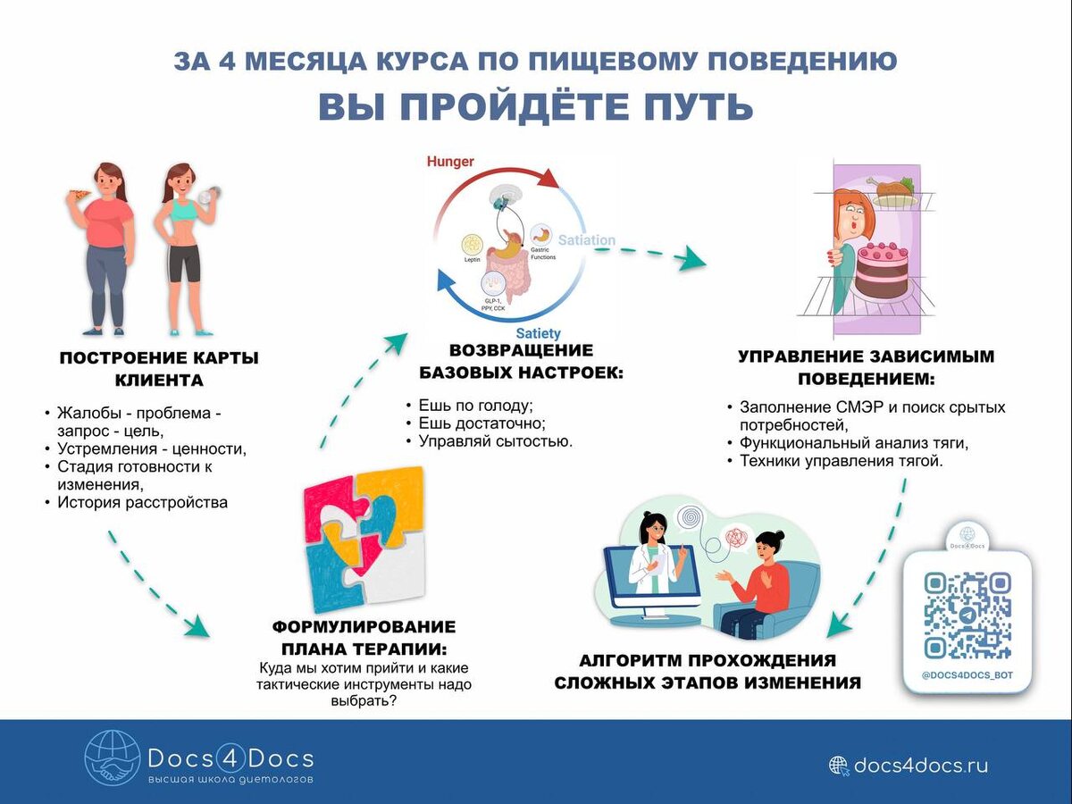 ». А стартуем 9 марта! Это совершенно новый курс. Он не повторяет мастерскую или мини-курс «4 кита стройности». Новые знания, новые подходы! Подходит как для специалистов по питанию с высшим медицинским образованием, так и без: ▪️диетологам/нутрициологам; ▪️психологам; ▪️любым врачам, кто работает с пациентами с избытком веса, ожирением и перееданиями. Стоимость - 80000 руб. Вы можете оформить рассрочку у Т-банка, просто напишите об этом администратору. Забирайте места через @Docs4Docs_bot Вас ждет 3 больших блока: ➖1 блог - Основы работы с пищевым поведением: 1️⃣ тема - Формулирование проблемы - запроса - цели. 2️⃣ тема - Оценка стадии готовности к изменениям. 3️⃣ тема - Построение карты клиента. На основе карты клиента строится план терапии. 4️⃣ тема - Составление плана терапии. Куда мы хотим прийти и какие тактические инструменты надо выбрать? ➖2 блог - Стратегия и тактика работы с пищевым поведением 1️⃣ тема - Пищевое поведение у разных психотипов. Поведение - это ре