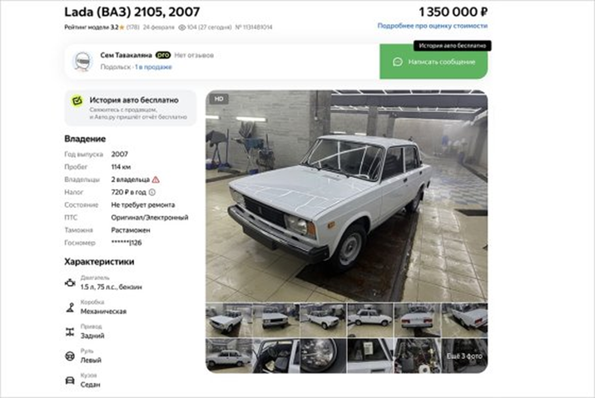 В Подольске продают ВАЗ-2105 2007 года без пробега - цена как у новой Lada Iskra Неожиданное объявление удивило автолюбителей: в Подольске выставили на продажу ВАЗ-2105, который почти 20 лет простоял без движения. Почему за него просят сумму, сравнимую с ценой нового авто, и что скрывается за этим предложением - разбираемся. Фотография: 110km.ru На рынке подержанных автомобилей России редко встречаются по-настоящему уникальные экземпляры, но именно такой случай произошел в Подольске. Здесь выставили на продажу ВАЗ-2105 2007 года выпуска, который за все время проехал всего 114 километров. Для отечественных автолюбителей это не просто редкость – это настоящий шанс прикоснуться к прошлому, когда «пятерки» еще шли с конвейера в первозданном виде. Судя по фотографиям из объявления, автомобиль сохранился в идеальном состоянии: белоснежный кузов не тронут временем, на стеклах — заводские наклейки, а салон укрыт прозрачными чехлами. Создается впечатление, что машина только что покинула автосал