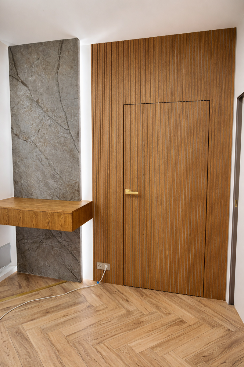 Стеновая панель и дверь из МДФ в натуральном шпоне с фрезеровкой — это не просто отделка, а полноценный архитектурный элемент интерьера. Такое решение создаёт цельное пространство, добавляет глубину и подчёркивает уровень дизайна.