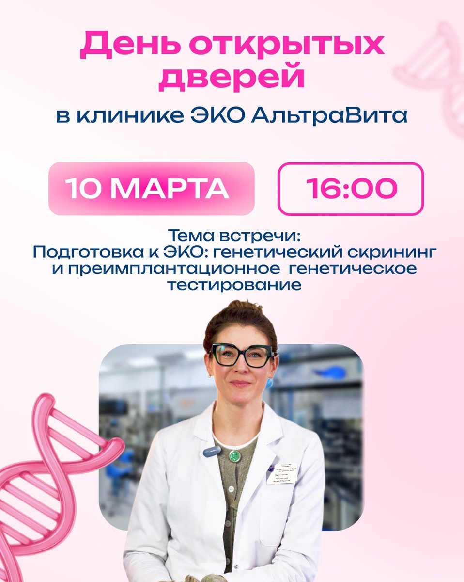, посвящённый теме: «Подготовка к ЭКО: генетический скрининг и ПГТ». Это возможность заглянуть внутрь клиники, разобраться в сложных медицинских вопросах простым языком и спросить всё, что волнует, без записи на приём — в спокойной атмосфере. Еще вас ждет: 🔬 Экскурсия в эмбриологическую лабораторию 🎁 Специальные условия для участников мероприятия Подробнее: Дата: 10 марта Время: 16:00 Место: г. Москва, ул. Нагорная, д. 4А Всего 12-ть мест — рекомендуем записаться заранее Контакт для записи: @Margo_AltraVita Будем рады видеть вас 🤍