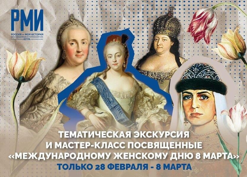 10.00 – экскурсия «Женщины в русской истории» (парк «Россия – моя история. Югра», Мелик-Карамова, 4/4). На примере великих личностей и правительниц взрослые и дети выяснят, как менялась роль женщины во власти и как их решения влияли на судьбу нашей страны. Посетители узнают больше о княгине Ольге, Софье Палеолог, Елизавете Петровне, Екатерине Великой и других. Также каждый желающий сможет создать праздничную объемную открытку из картона и цветной бумаги. Мероприятие проводится по предварительной записи по телефону 58-90-90.