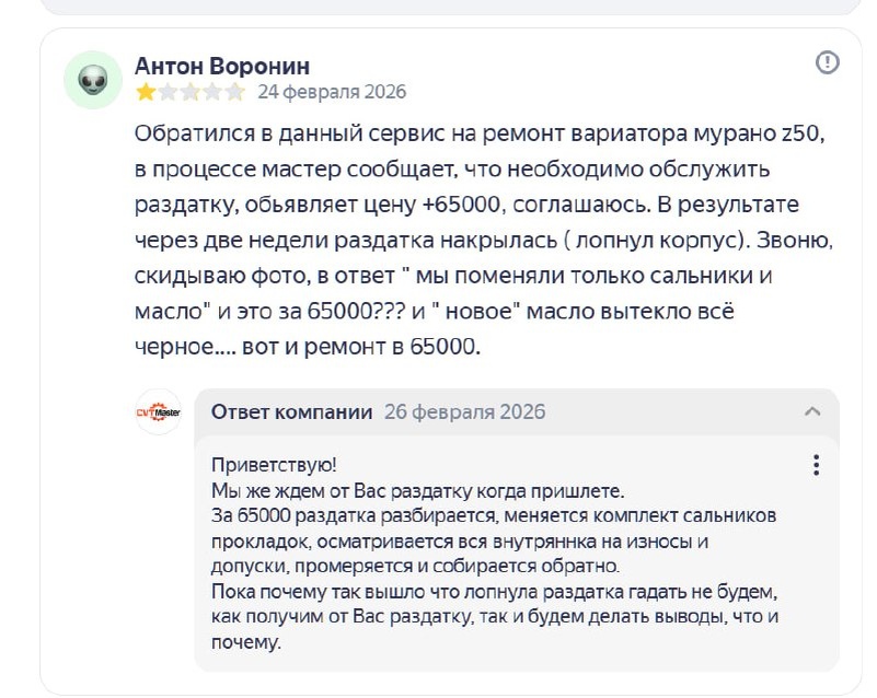 !!! По поводу гарантии, кто что делает. Скажу сразу, бывает всякое, и наша обязанность перед клиентом понять что же случилось, почему и из за чего так или иначе вышло. И вот что на днях случилось. Сделали мы ремонт вариатора и плюсом переуплотнили и провели скажем так полное ТО по раздатке (Типичная болячка скажем так на Мурано). Стоит это 65000р. Соответственно все с гарантией. Клиенту после обращения что с раздатки что то потекло сказали, снимай и присылай, или пригоняй авто. Будем смотреть что и почему так вышло. Но почему надо написать отзыв до результатов, это нам не понятно. Если Вы переживаете что мы как то снимем с себя обязательства, то нет, у нас политика не "срубить бабла" и свалить в закат (как кстати делают многие) у нас задача сделать и чтоб навсегда, и что клиента эта проблема не беспокоила. У нас нет одноразовых клиентов. Поэтому сидим и ждем эту раздатку.... Теперь самим интересно а что там....
