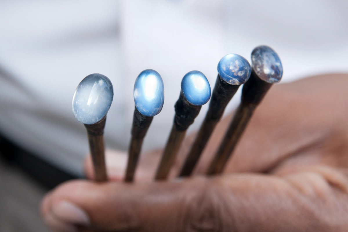 Но красота — реальна. «Лунным камнем» называют не один конкретный минерал, а разновидности полевых шпатов, обладающие эффектом иризации (правильный термин — адуляресценция). Этот эффект возникает из-за внутреннего строения камня. Представьте многослойный «минеральный бутерброд» — тончайшие пластины, через которые проходит свет. Лучи рассеиваются и создают характерное голубоватое свечение, будто внутри камня живёт лунный туман. Самый ценный ювелирный лунный камень — адуляр. Название он получил от горы Адула в швейцарских Альпах, где его впервые описали. Но лучшие современные образцы добываются не в Швейцарии. Самые ценные лунные камни сегодня приходят с