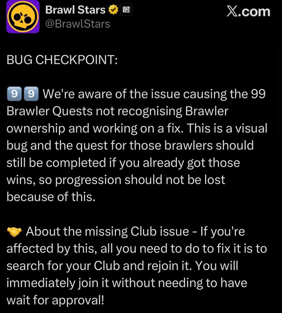 Разработчики заявили, что они знают о некоторых багов и скоро их пофиксят: — Баг, из-за которого отображение владения бравлерами в квесте на Сириуса отсутствует, является визуальным. Вы все равно можете выполнять квесты, а после фикса все должно отображаться правильно; — Если у вас отсутствует клуб, то это решается. Вам нужно найти свой клуб и зайти в него снова, даже не надо будет дожидаться подтверждения; — О проблемах с серверами разрабы не говорили, но вероятно, что лагает DNS-сервер. Советуем вам временно перейти на приложение для смены местоположения. ✅Новости по Clash Royale - ТЫК Мир Supercell. Подписаться