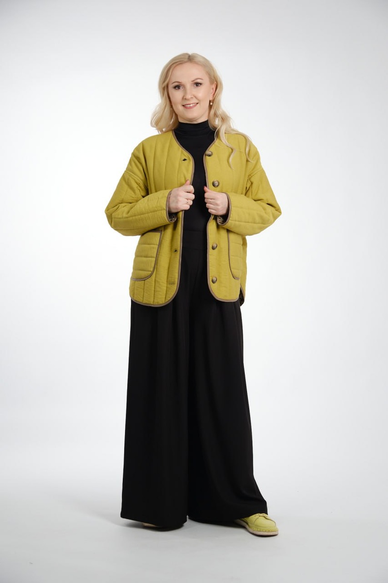 48/50,52/54,60/62. модель для межсезонья, в которой цвет и форма работают на результат. Сочный оттенок «яблоко» делает образ живым и заметным, а свободный оверсайз-крой обеспечивает комфортную посадку без привязки к типу фигуры. Отсутствие воротника оставляет линию горловины открытой и аккуратной — фуфайка легко сочетается с шарфами, водолазками и многослойными комплектами. Верх выполнен из хлопковой ткани с добавлением полиэстера — материал приятен в носке, хорошо держит форму и подходит для активного ритма города. Внутри используется утеплитель синтепон плотностью 100 г, благодаря чему модель рассчитана на прохладную осень и весну, когда важно сохранить тепло без утяжеления силуэта. Вертикальная стёжка придаёт конструкции чёткость, а контрастная подкладка с рисунком делает фуфайку двусторонней — образ можно менять, просто перевернув изделие. Накладные карманы глубокие и функциональные, а боковые разрезы на пуговицах добавляют свободы движений и подчёркивают продуманность кроя. Ак