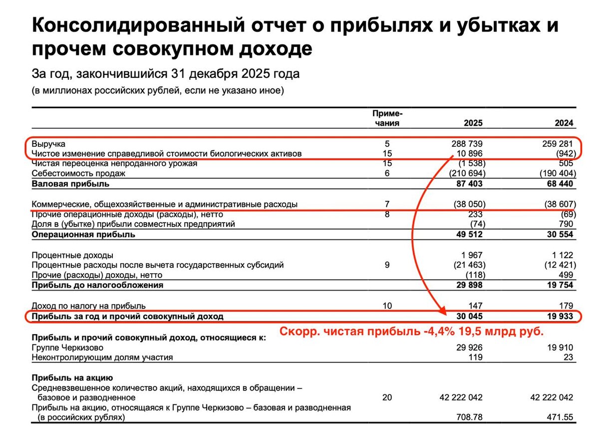 В ноябре прошлого года мы с вами прожарили отчет Черкизово за 3 квартал, зафиксировав стратегическое улучшение финансовых метрик. С момента публикации того отчета акции компании прибавили более 18%, кратно обогнав Индекс Мосбиржи. Настало время разобрать отчет уже за полный 2025 год. 🍗 Итак, чистая выручка Черкизово за отчетный период выросла на 11,4% до 288,7 млрд рублей. Значимым драйвером роста является сегмент Фудсервиса, который прибавил 19%. Компания продолжает наращивать продажи брендированной продукции в ритейле под марками «Петелинка», «Пава-Пава», «Черкизово» и др. Компания впервые в своей истории произвела за год суммарно более 1,5 млн тонн мяса в живом весе. Это все с учетом объемов свинины (336 тыс. тонн) и объемов индейки (82 тыс. тонн). Также Группа вновь стала крупнейшим производителем мяса бройлеров в России. 📊 Себестоимость продаж за 2025 год выросла незначительно, а операционные расходы и вовсе осталась на уровне предыдущего года. В итоге Черкизово нарастила скорр