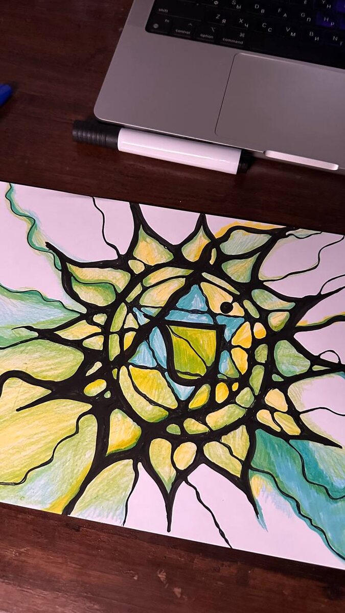 💚 По идее, рисунок должен быть зелёным. Сердце — это зелёный. Любовь. Принятие. Мягкость. Но у меня в процессе сами собой вписались жёлтый и голубой. И я сначала даже не поняла — почему. А потом сижу и думаю… Сердечная чакра находится в груди. Но по факту она между: 💛 Манипурой — третьей чакрой (солнечное сплетение, сила, проявление, «я есть») и 🩵 Вишудхой — пятой (горло, голос, самовыражение). И вдруг сложилось. Сердце — это не просто «любить». Это светить. И говорить. Это соединение: — силы заявить о себе (жёлтая) — и смелости говорить голосом души (голубая) Если нет третьей — сердце тихое, но спрятанное. Если нет пятой — сердце чувствует, но молчит. А зелёная — между ними. Как мост. И я поняла, что именно так я неосознанно вижу работу сердца: ✨ светить изнутри ✨ творить из сердца ✨ говорить правду голосом души И когда всё это соединяется — человек становится целостным. Интересно… А вы чувствуете, что можете свободно говорить из сердца? Или где-то зажим — в проявлени