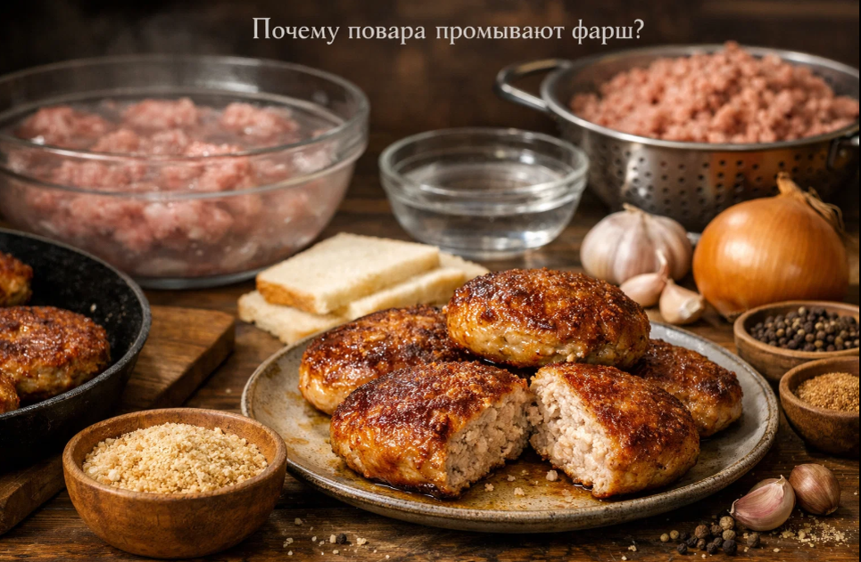 Казалось бы, что может быть проще приготовления котлет? Купил фарш, добавил яйцо, лук, хлеб, слепил и пожарил. Однако профессиональные повара знают множество хитростей, которые превращают обычное домашнее блюдо в настоящий кулинарный шедевр. Одна из таких техник вызывает недоумение у начинающих кулинаров – зачем же опытные мастера промывают фарш холодной водой перед тем, как начать формировать котлеты?