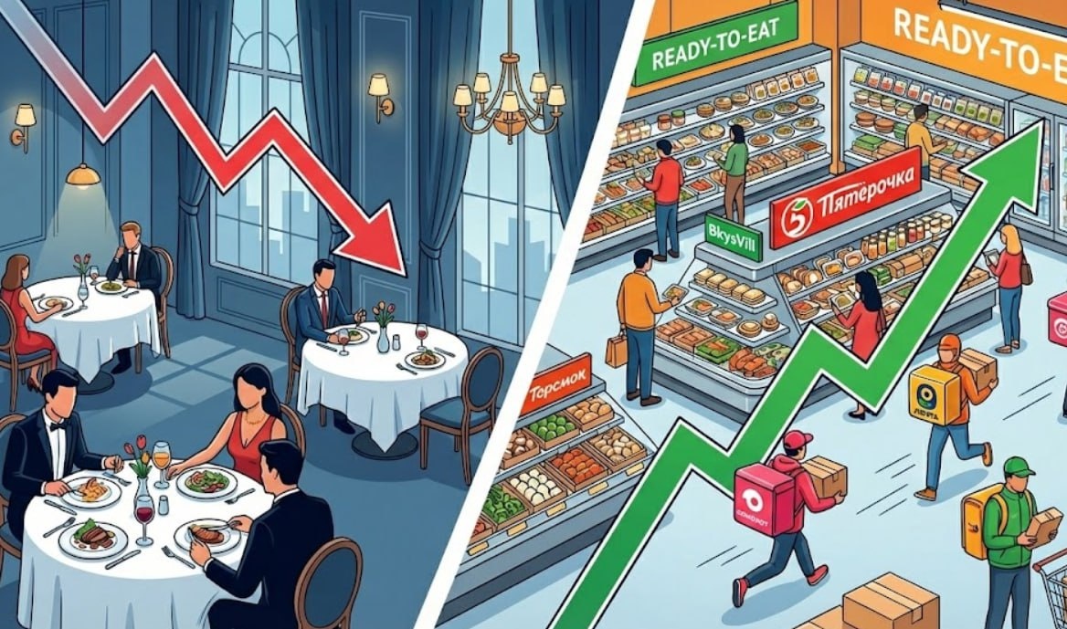 Аналитика показывает жесткую трансформацию: с начала года поток гостей в ряде сетей рухнул на 14–32%. Повседневные визиты сокращаются — люди все чаще выбирают готовую еду из супермаркетов, оставляя рестораны исключительно для «особых случаев». Как следствие, средний чек продолжает расти. Как адаптируется HoReCa: 🟩 Сеть «Шоколадница» оптимизировала бизнес, закрыв 20% своих объектов. 🟩 «Теремок» и Monsta Family делают основную ставку на развитие по франшизе. 🟩 Гибридные форматы (такие как «ВкусВилл в пути» и «Хлебник Экспресс») активно перехватывают трафик «на ходу». Ритейл и доставка забирают аудиторию: Конкуренция продуктовых сетей и классического общепита обострилась до предела. • В «Пятерочке» доля готовой еды достигла 5% (впечатляющий рост на +45% за год). • «Магнит» открыл 24 раменных прямо внутри магазинов «у дома». • «Лента» начала тестирование собственных мини-кофеен. • Доставка бьет рекорды: по итогам 2025 года оборот «Самоката» вырос на 12,3% (до 279,3 млрд руб). По данны