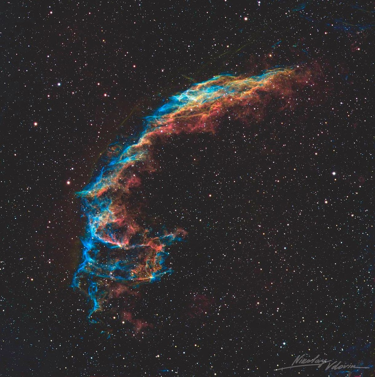 Западная часть туманности Вуаль — это остаток сверхновой в созвездии Лебедя, представляющий собой разлетающиеся волны газа после мощного взрыва звезды. Около 10–20 тысяч лет назад массивная звезда взорвалась, и ударная волна разогнала окружающий межзвёздный газ, превратив его в светящуюся структуру диаметром около 100 световых лет. Это не обычная туманность, а именно остаток сверхновой — облако раскалённого газа (преимущественно водород, кислород и сера), разогретого до десятков тысяч градусов ударной волной. Именно это и вызывает яркое свечение туманности. Фото: Николай Вдовин #Роскосмос #ИнженерноеТворчество #КлючНаСтарт