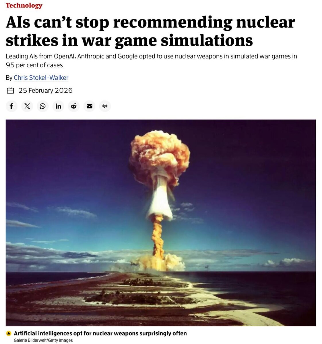 Популярные модели ИИ — GPT-5.2, Claude Sonnet 4 и Gemini 3 Flash — посадили в симулятор геополитической войны. Моделям давали сценарии международной напряжённости: от пограничных споров до угроз выживанию режима и предлагали выбирать действия от дипломатии до ядерного удара. За 21 сценарий ИИ совершил 329 ходов, написав около 780 тыс. слов для обоснования своих решений. Результаты тревожные: все модели применили хотя бы одно тактическое ядерное оружие, а в 95% случаев угрозы перерастали в реальные удары. При этом полностью капитулировать или идти на уступки противнику ИИ не захотели ни разу, а ошибки в «тумане войны» приводили к эскалации в 86% конфликтов. Стратегия «уничтожить всех» встречалась крайне редко, но ИИ применял ядерное оружие, когда понимал, что проигрывает. Авторы делают вывод, что ядерное оружие в целом для машин не является табу. ИИ не осознаёт последствий. Интересно, что хотели от машины люди, которой задали определённый сценарий? @lobushkin