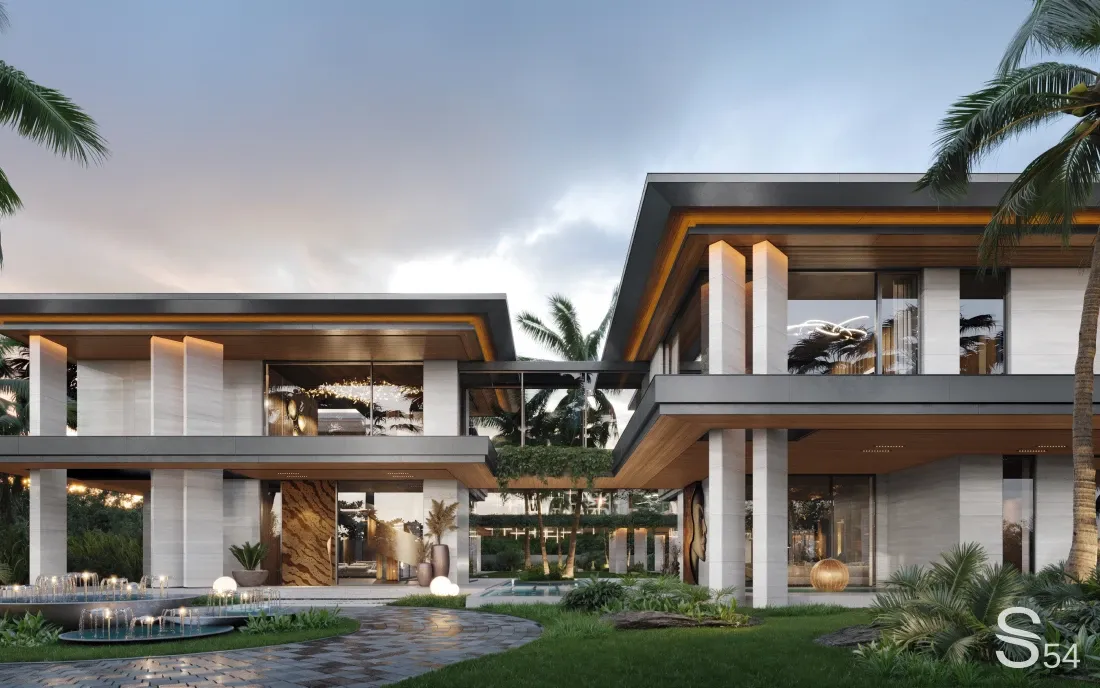Команда Studia 54 создала уникальную резиденцию площадью 800 м², где современный комфорт гармонично сочетается с историческим наследием региона Бенин. Вот пять причин, почему этот дом впечатляет с первого взгляда. Cтрана: Нигерия Площадь: 800 м² Обсудить ваш проект с экспертом от Studia 54: WhatsApp +7 (931) 270-54-54 welcome@studia-54.ru Название виллы отсылает к древнему государству Бенин, существовавшему с XII века. Культура, торговые пути и традиции региона стали источником идей для дизайна. Каждая деталь дома — от колонн из травертина до этнических арт-объектов — сохраняет связь с историей. Вилла разделена на семейный и гостевой блоки, соединённые эстакадами. Приватность сохранена, а перемещение между зонами плавное. Дом рассчитан как на повседневную жизнь, так и на масштабные мероприятия. Двор площадью 500 м² стал сердцем виллы. Здесь можно проводить вечеринки, встречи и кино под открытым небом. Лаунж-зоны, продуманные маршруты и водные элементы создают атмосферу уюта и прохлады