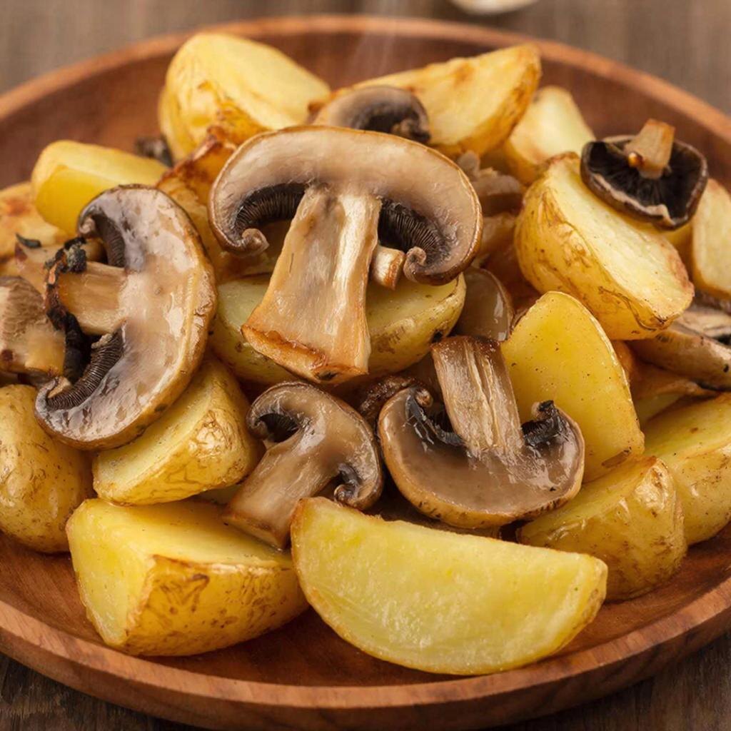 Лучше всего к картофелю подходят следующие виды грибов: 1. Белые грибы 2. Подосиновики 3. Опята 4. Шампиньоны 5. Маслята 6. Лисички Советы по приготовлению Для картофеля с белыми грибами отлично подойдут следующие специи и травы, которые подчеркнут натуральный вкус и аромат блюда: Основные специи: 1. Черный молотый перецКлассический выбор, придаёт блюду приятную остроту и пикантность. 2. Соль морская или каменнаяУсилит натуральные вкусы картофеля и грибов, раскрывая глубину аромата. 3. Свежий тимьянПриятный травяной аромат прекрасно сочетается с грибами и картофелем, добавляет свежести и глубины. 4. Укроп свежий или сушеныйЛегкий освежающий аромат, идеально подходящий для грибных блюд. 5. Петрушка свежаяОсвежающая травянистость подчеркивает природный вкус белых грибов. 6. Зелень чеснокаМягкая чесночковая нотка придает особый шарм и дополнительную пикантность. 7. Лавровый листНасыщенный древесный аромат усиливает общий букет гриба и картофеля. 8. Душистый перец горошкомНежная пряность х