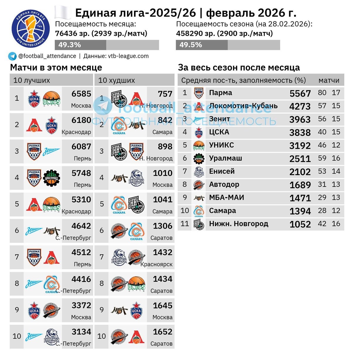 Аудитория фервальских матчей (2939 зр./матч в среднем) была на уровне среднего значения в сезоне (2900). Три матча в феврале собрали шесть и более тысяч зрителей в трёх разных городах: в Москве (6585), Краснодаре (6180) и Перми (6087). Эти встречи стали 4-й, 12-й и 16-й в рейтинге самых посещаемых матчей текущего сезона Единой Лиги. В части антирекордов, то минимум был вновь в Нижнем Новгороде -- только 757 человек на игре «Пари НН» и «Локомотив-Кубани». Это 4-я по наименьшему значению зрителей игра в этом сезоне ЕЛ. Сразу три встречи собрали менее тысячи болельщиков в прошедшем месяца. В таблице домашней посещаемости текущего сезона изменений не произошло ни на одной из позиций. Посещаемость месяца Не забывайте подписаться на канал здесь на Дзен, а также в Телеграм и МАХ! Также вы можете отблагодарить мою работу донатами на главной странице канала!