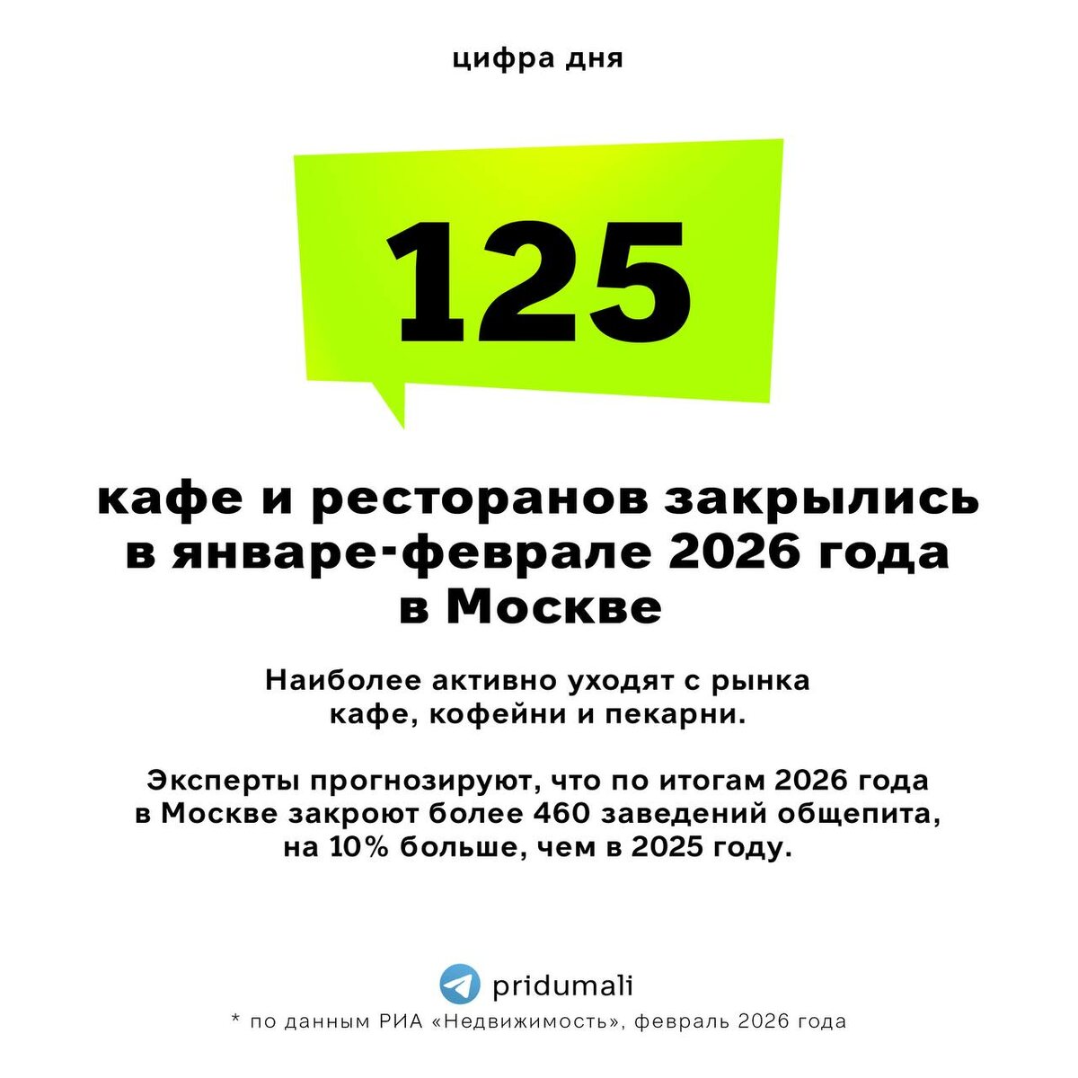 В рубрике «Цифра дня» данные РИА «Недвижимость» — 125 кафе и ресторанов закрылись в Москве за первые два месяца 2026 года. Это почти в два раза больше, чем год назад. Наиболее активно, как и в прошлом году, закрываются кафе, кофейни и пекарни. Кроме того, часть спроса перетекает в доставку. Неутешительные прогнозы — эксперты ожидают, что по итогам 2026 года закроется более 460 заведений общепита. Это на 10% больше, чем в 2025 году. 👉подписаться на @pridumali #исследования