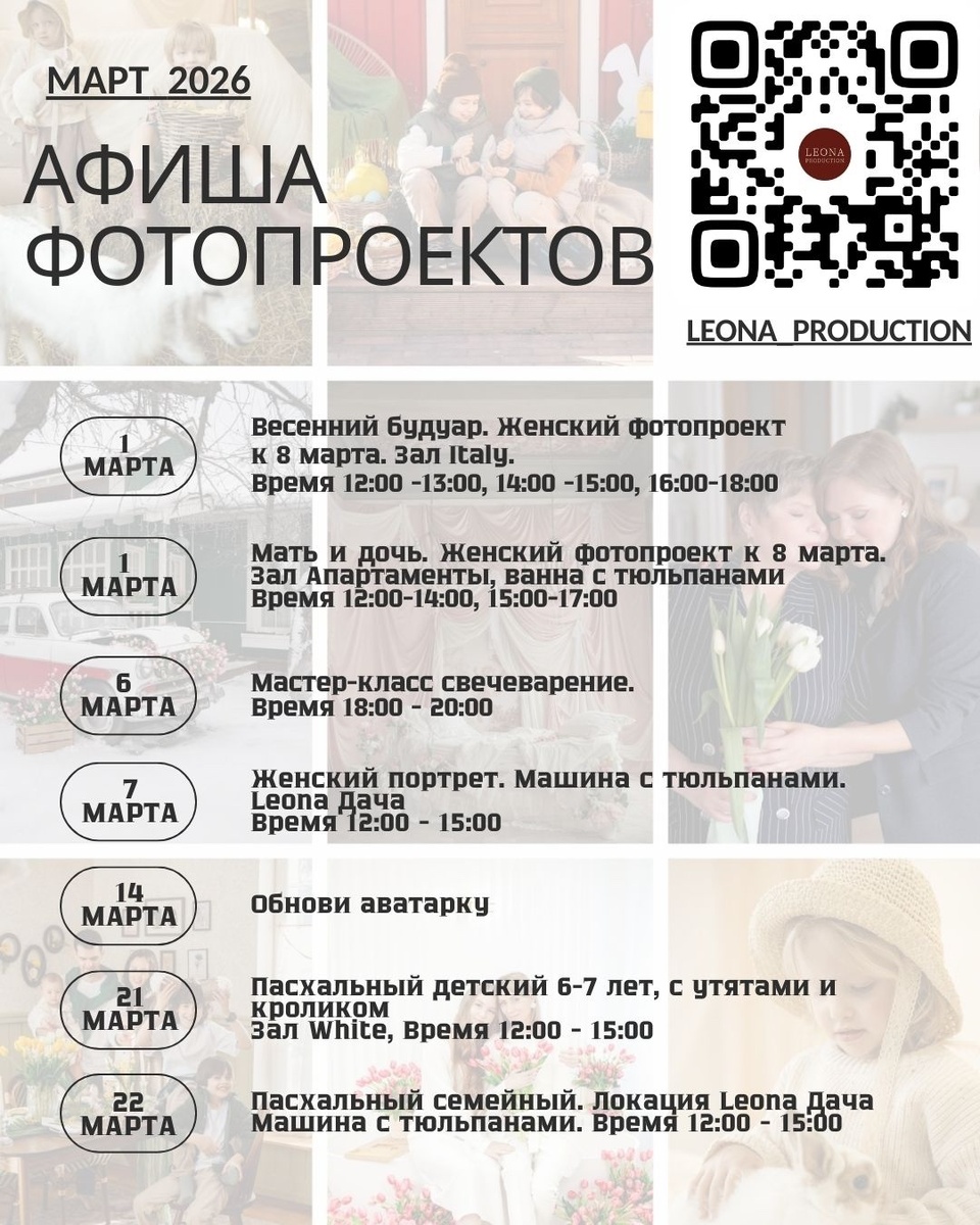 Мы подготовили расписание фотопроектов, которые будут проходить в марте. Сохраняйте себе и записывайтесь! Узнать больше информации или забронировать себе место можно, написав нам в личные сообщения @leonastage_photostudio.