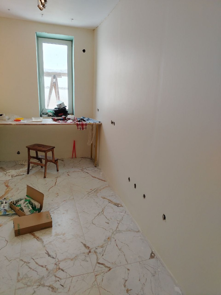 Стройка после работы - вещь более чем напряжная. Думаю, многим это знакомо: свободного времени и сил остаётся не так много, но хочется поскорее добиться результата. Вот и в случае с обустройством кладовой комнаты мы делали всё по выходным и в будние дни после работы. Вот что вышло: На полу: 30 мм бетонной стяжки, 6 мм ровнителя и керамогранит 9 мм.
