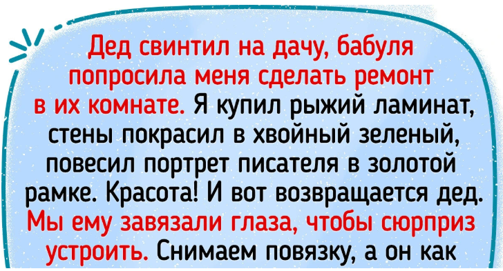 Дед свинтил на дачу, бабуля попросила меня сделать ремонт в их комнате. Я купил рыжий ламинат, стены покрасил в хвойный зеленый, повесил портрет писателя в золотой рамке. Красота! И вот возвращается дед. Мы ему завязали глаза, чтобы сюрприз устроить. Снимаем повязку, а он как выдаст: "О как! Значит, меня не было всего-то 2 недели, а ты уже портрет какого-то мужика повесила?!"