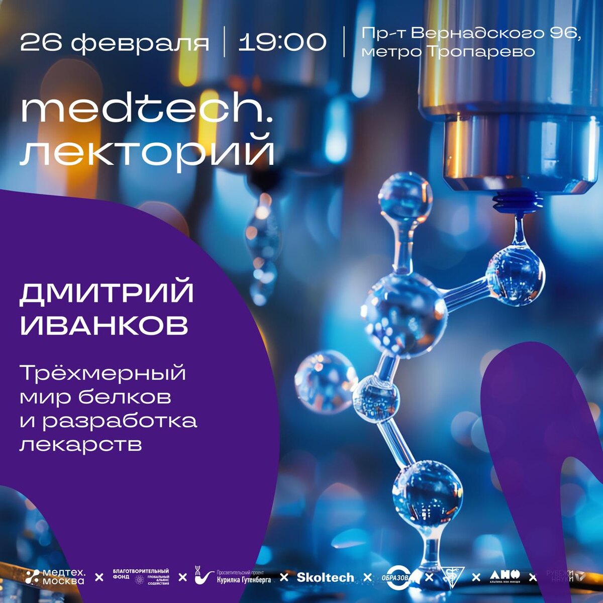! Подключайтесь к онлайн-трансляции или регистрируйтесь для очного участия в новой лекции Medtech.Лектория: 🔹 Спикер: Дмитрий Иванков, профессор Центра био- и медицинских технологий Сколтеха. 🔹 Тема: «Трёхмерный мир белков и разработка лекарств» Разберём, как по аминокислотной последовательности предсказывают 3D-структуру белков, почему пространственная организация определяет их функции и как методы молекулярного докинга расширяют возможности современной фармацевтики. Начало в 19:00 – увидимся совсем скоро!