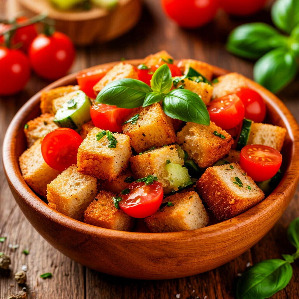 Почему это изюминка: Панцанелла — идеальный летний салат, где хлеб не размякает, а пропитывается соками овощей и становится невероятно вкусным.