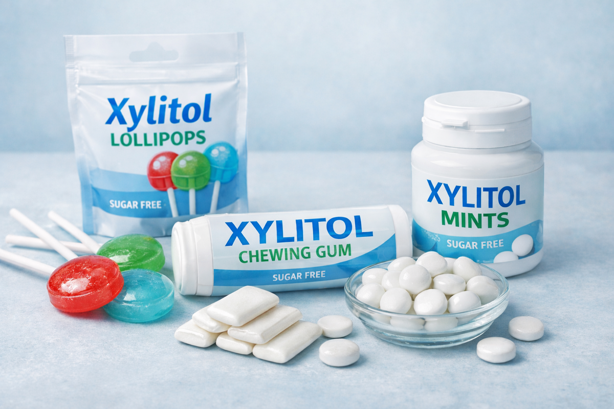 Ксилит часто можно увидеть в составе жевательных резинок, леденцов и даже детских паст. Его называют «безопасным сахаром» и рекомендуют для профилактики кариеса. Но что это за вещество с точки зрения стоматологии — маркетинг или реальная польза? Ксилит — это сахарный спирт, натуральное вещество, которое получают из растительного сырья (например, древесины берёзы или кукурузных волокон). По вкусу он сладкий, но имеет принципиальное отличие от обычного сахара: бактерии полости рта не могут использовать его как источник энергии. Именно в этом его стоматологическая ценность. Основной «виновник» кариеса — бактерия Streptococcus mutans. Она перерабатывает сахара, образуя кислоты, которые разрушают эмаль. Ксилит нарушает этот процесс: При регулярном использовании количество кариесогенных бактерий постепенно снижается. Кроме влияния на микрофлору, есть ещё два механизма: Жевательная резинка с ксилитом усиливает выработку слюны. Слюна: Ксилит не вызывает резкой смены pH в полости рта. Важно пон