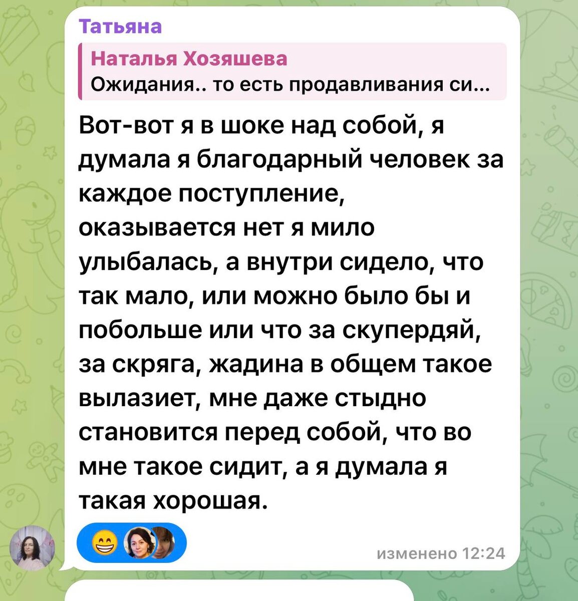». Много работаем над этой сферой. С разных сторон ее изучаем и убираем блоки, мешающие принимать те самые деньги. 💵 Провела просто игру «Подарок от мира». И вот такие осознания у участников. ⬆️ Отличная тема, чтобы вскрыть свои установки. ‼️Особенно в период коридора затмений. Самое оно, поработать над глубинными убеждениями. Хочешь с нами? Пиши @simona689 «Клуб»