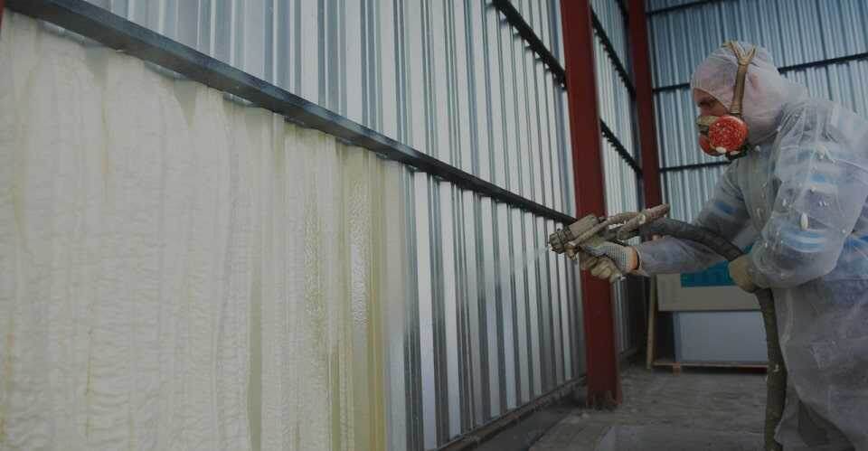 Оборудование — реактор высокого давления типа Graco Reactor или отечественные аналоги: подогрев компонентов до 40–50°C, давление 150 бар, шланги 30–50 м. Полиол (компонент А) и изоцианат (Б) подаются параллельно в смесительную камеру пистолета. Расход настраивают под плотность 30–35 кг/м³: 2,5–3 кг/м² на 50 мм. Первый слой 20–30 мм, пауза 10 мин для отверждения, второй — до расчетной толщины. Оператор в костюме ХИМЗАЩИТА, респираторе FFP3, очках: безопасность превыше всего.