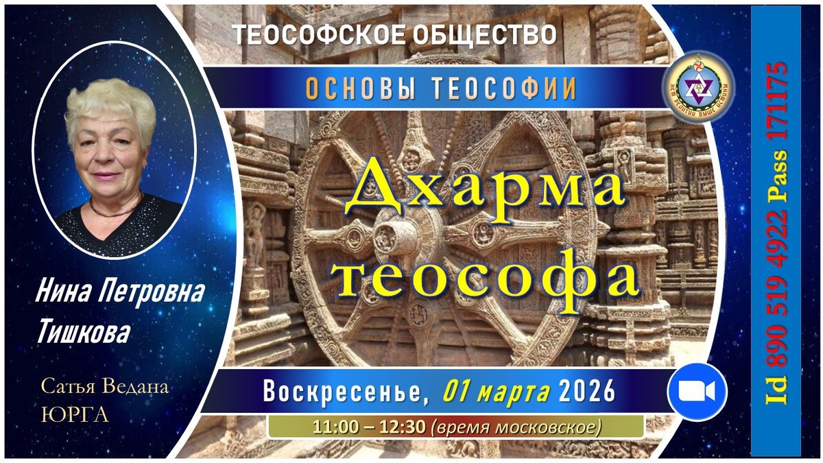 🌺В это воскресенье, 01 марта 2026 года, в 11.00 (время московское) в рамках проекта «Основы теософии» состоится встреча на тему: ⚡️«ДХАРМА ТЕОСОФА»⚡️ 👩🎓СПИКЕР: Нина Петровна Тишкова (Отд. "Сатья Ведана", г. Юрга). ⏺️⏺️⏺️Вход в ZOOM: www.zoom.us Id: 890 519 4922 Pass: 171175 Быстрый вход в лекторий по ссылке: https://clck.ru/37Q6hC Предварительная регистрация и установка программ - не нужны. Участие - бесплатное. Включение вашей персональной камеры - не требуется. ‼️Все вопросы вы можете направить по адресу: secretary@ts-russia.org