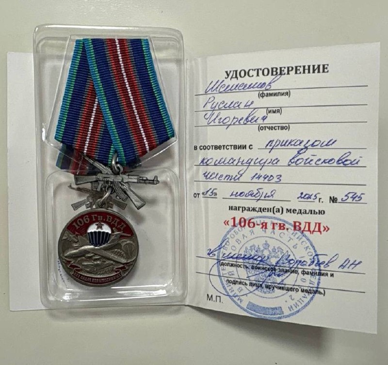Дорогие друзья, хотел бы поделиться: из рук 106-й гвардейской воздушно‑десантной дивизии в соответствии с приказом получил памятную медаль