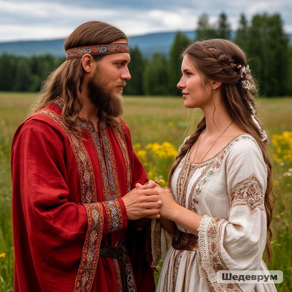 - Обход вокруг очага: Молодые трижды обходили вокруг огня или дуба, призывая в свидетели богов Прави (Сварога и Ладу). 🌳🔥