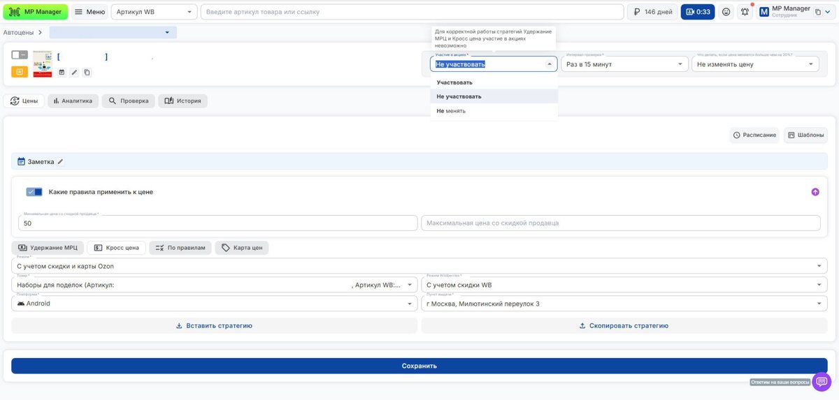Больше не нужно вручную добавлять товары в каждую акцию. Теперь в разделе «Цены» вы можете включить функцию автоматического участия в подходящих акциях Ozon – прямо из интерфейса MP Manager. Что это даёт: ✔️ Товар автоматически участвует во всех доступных акциях Ozon ✔️ Вы не пропускаете выгодные промо-периоды ✔️ Экономите время на ручной работе ✔️ Контролируете минимальную цену, ниже которой товар не опустится Важно: Функция не работает для стратегий «Удержание МРЦ» и «Кросс-цена» – из-за особенностей их логики. Всё остальное – подключается в один клик и работает автоматически. 💚 Ещё не подключили «Цены»? Сейчас самый выгодный момент. 🎉 MP Manager – 4 года! Дарим –30% на оплату и продление тарифов. Промокод: MP4YEARS Действует до 1 марта включительно. Активируйте промокод и масштабируйтесь вместе с MP Manager 🚀 Перейти в сервис #Ozon #Акции