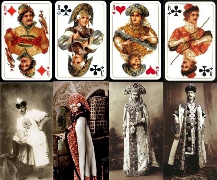 - Король пик — прототипа нет (костюм Ивана Грозного, изображённый на картине А. Д. Литовченко «Иван Грозный показывает сокровища английскому послу Горсею»).