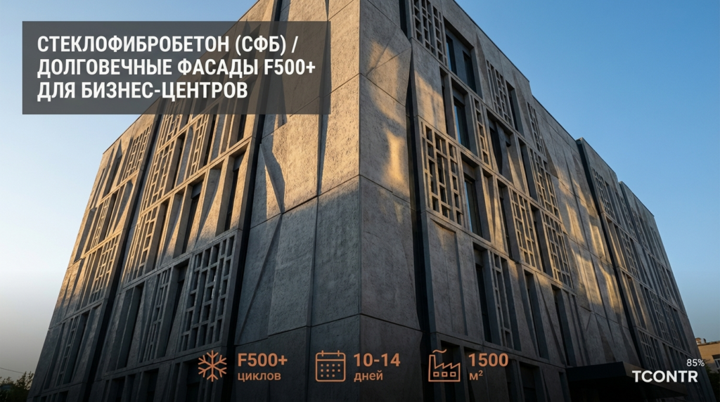 Главный тренд 2026 года в высотном строительстве — снижение нагрузки на несущие конструкции. Натуральный камень весит более 200 кг/м². Это требует мощного фундамента и дорогой подсистемы. Стеклофибробетон (СФБ) меняет правила игры: