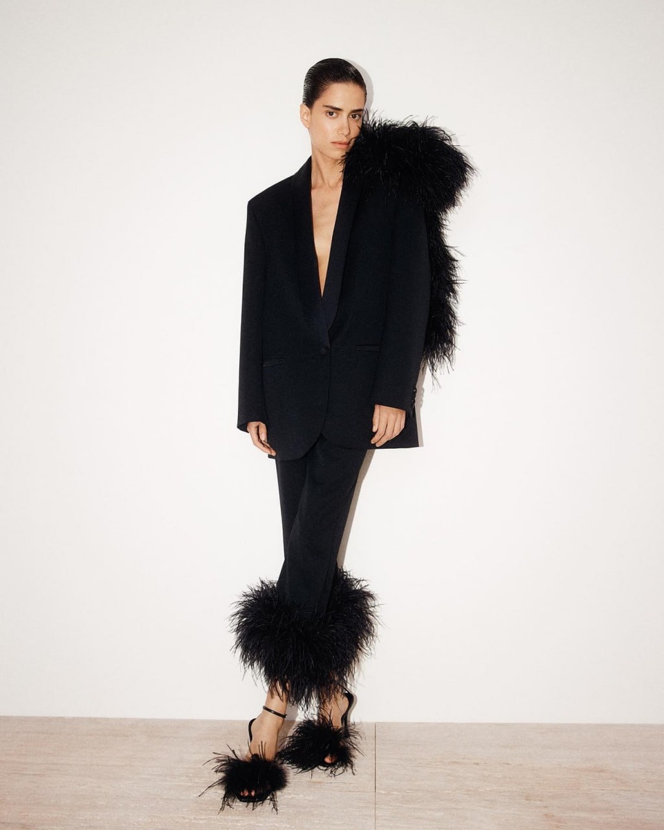 Перья по-прежнему остаются одним из главных вечерних трендов. Брюки от Magda Butrym с укороченной длиной и перьевой отделкой как раз обыгрывают эту тенденцию, добавляя образу выразительности. В паре с ними пиджак от Jil Sander сохраняет строгость формы и позволяет перьям стать главным акцентом. Комплект подойдёт для ужина, мероприятия или праздничного выхода. Осталось 3 дня, чтобы приобрести данный дуэт с двойной выгодой 50%+30%. Пиджак Jil Sander Брюки Magda Butrym