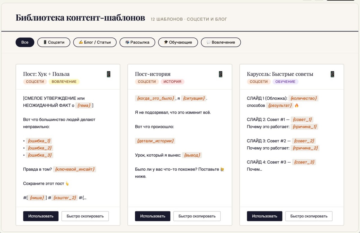Я: - не писала промты - не ставила никаких сложных задач - не описывала никаких конкретных нюансов Если честно, я просто тестировала Claude, потому что сегодня узнала, что у него есть внутренние классные плюшки, которых нет в ChatGPT. Как вам библиотека контент-шаблонов?)) Забирайте, пользуйтесь, она реально хороша. А я пойду создам еще что-то полезное. Что хотите?