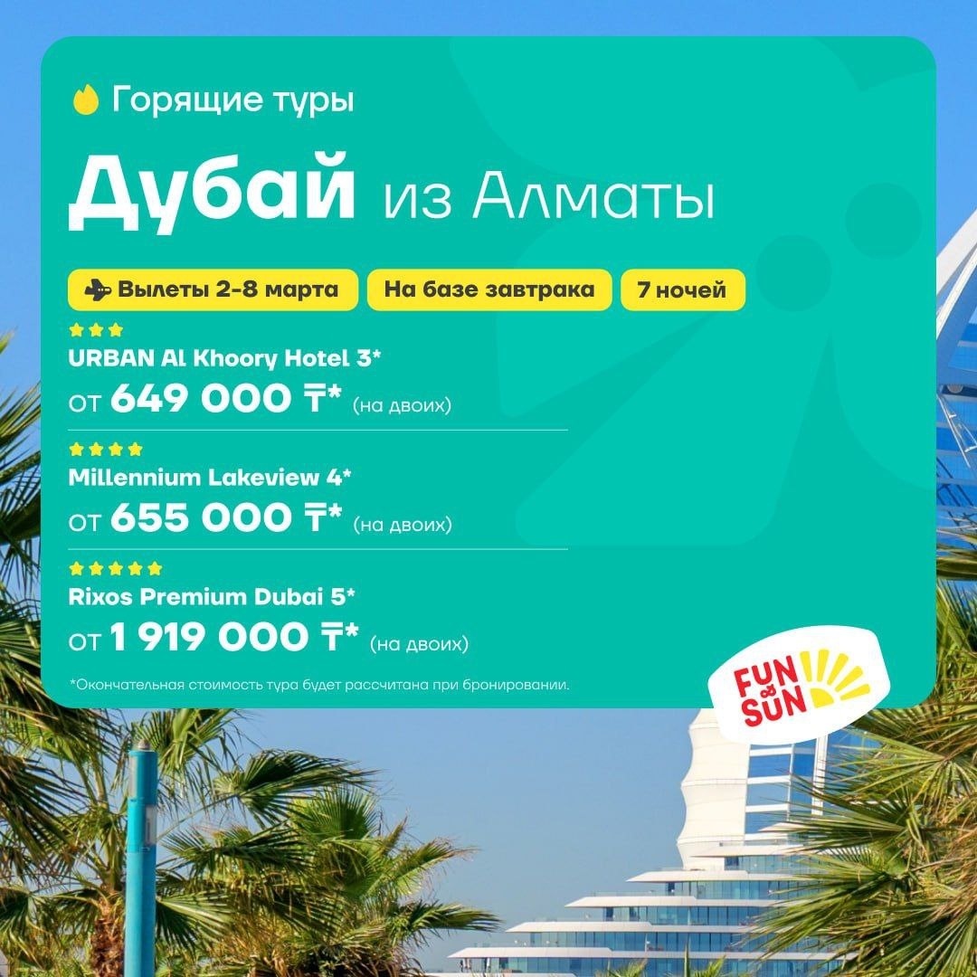 2–8 марта | 7 ночей | Завтраки Идеальные +28°C ☀️ Еще можно гулять весь день, не прячась в моллах. Собрали три абсолютно разных варианта под любой запрос: от стильного городского отеля до легендарного Rixos на первой линии 😉 Стоимость на ДВОИХ: ✨ URBAN Al Khoory 3* от 649 000 ₸ ✔️ Стильный, свежий, городской формат ✨ Millennium Lakeview 4* от 655 000 ₸ ✔️ Отличный вид и сервис ✨ Rixos Premium Dubai 5* от 1 919 000 ₸ ✔️ Тот самый движ на JBR Быстро подтверждаем бронь и фиксируем финальную стоимость⚡️ 📲 Напишите +77778742777 — подберем оптимальные даты и зафиксируем лучшую цену!