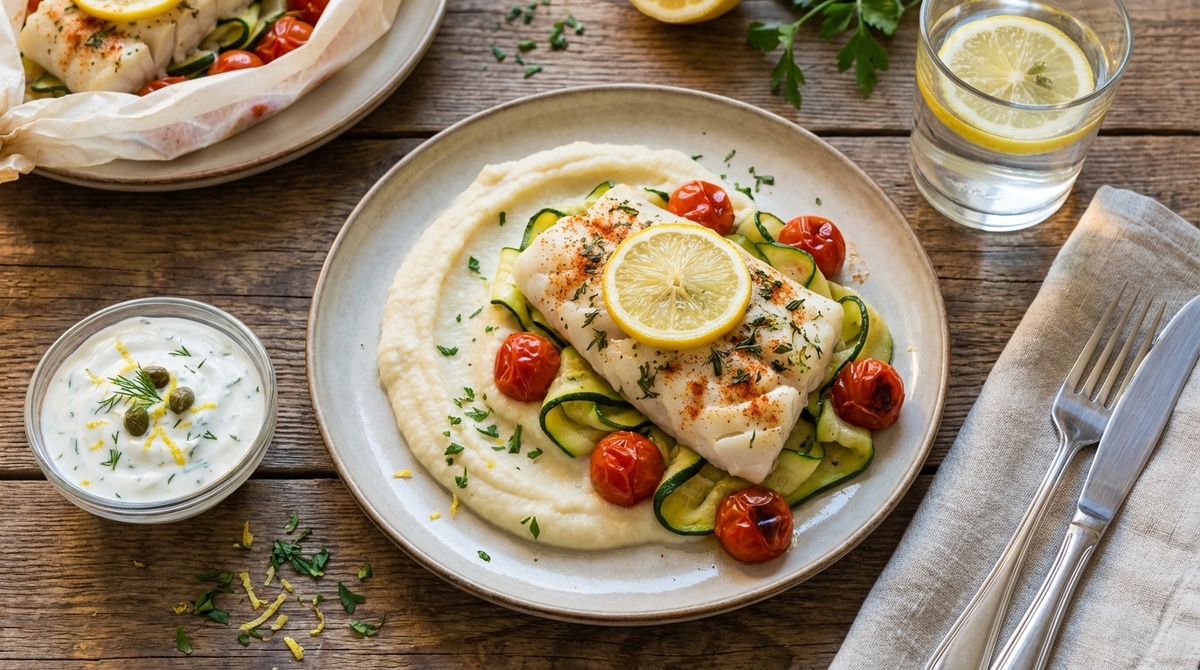Если хочется красивый ужин с подачей “как в кафе”, но без тяжести и лишних калорий — этот рецепт идеально попадает в цель. Рыба запекается в конверте из пергамента, остаётся сочной даже без масла, пюре — нежное и кремовое, а соус даёт тот самый “ресторанный” вкус. ✅ Сочно, ароматно, нарядно