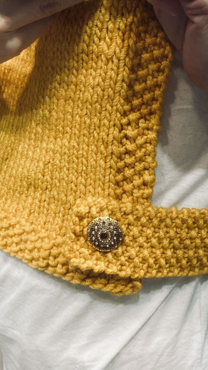 С лицевой стороны набираем 7 петель и вяжем жемчужным узором 30 рядов (13см). Формируем отверстие для пуговицы. И вяжем еще 6рядов. Закрываем петли. С другой стороны вяжем аналогичную полосу. Далее Пришиваем пуговицы.