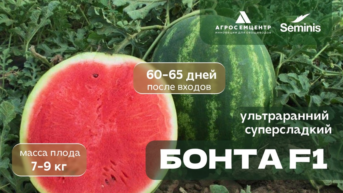 ? ✔️ Ультраранний — 60–65 дней до сбора ✔️ Стабильная завязываемость даже при стрессах ✔️ Выровненные плоды 7–9 кг — удобный коммерческий формат ✔️ Ярко-красная, очень сладкая мякоть ✔️ Плотная структура — отлично переносит транспортировку Бонта — это ранние деньги, высокая товарность и спокойный сезон без сюрпризов. Если нужен гибрид «под рынок» — вы его уже нашли _______________ Полезные материалы — в одном клике: 🥬Какие семена мы продаем 📦Как купить ✅VK ✅ ЯДзен ✅ MAX
