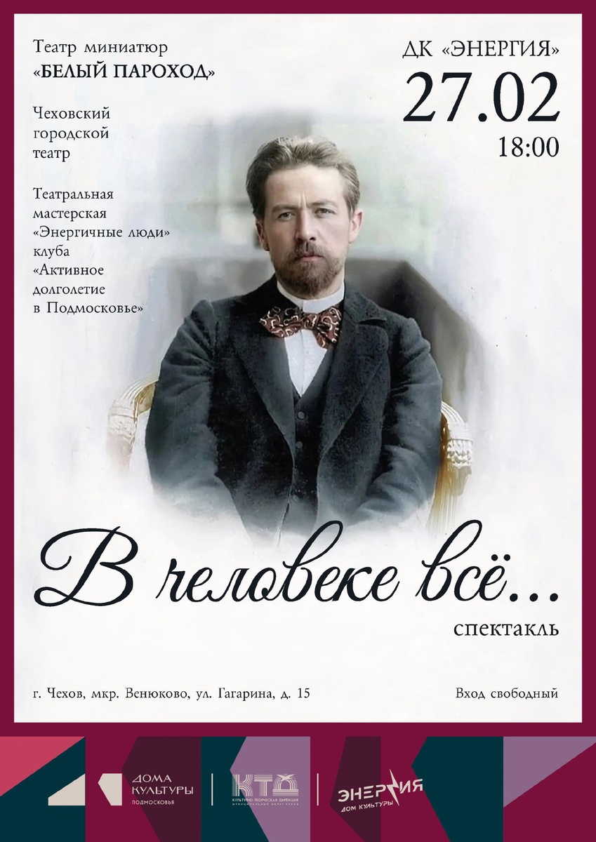 ✨ Спектакль "В чехове всё..." 📖Чеховский городской театр и Театральныя мастерская "Энергичные люди" клуба Активное долголетие приглашают Вас на совместный спектакль, посвящённый А.П. Чехову. 📆 27.02.2026 🕛 18:00 🏢 ДК «Энергия» 📍 г.о. Чехов, ул. Гагарина, д.15 🪙 Вход свободный❗️ ⭐Поддержать канал голосом ✅ Мероприятия Чехов https://dzen.ru/id/66cc4b48e9ef144699238a51 http://vk.com/chekhov_events http://dzen.ru/chekhov_events