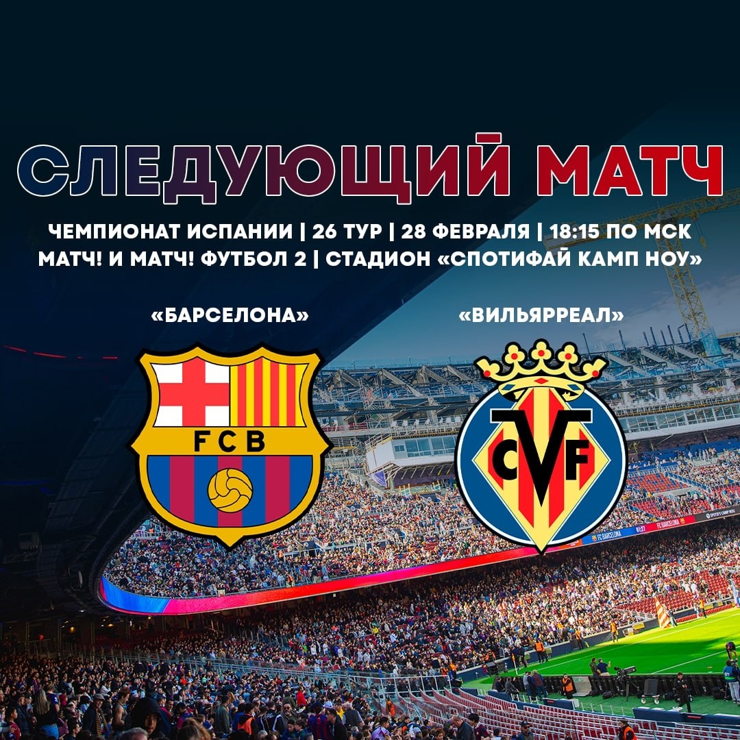 28 февраля в 18:15 Футбол. Барселона - Вильярреал. Чемпионат Испании (изображение: vk.com/public2977)